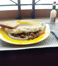 - Heat the olive oil in a 10 inch pan. Add the beaten egg and cook for a few minutes checking with a spatula to see when the bottom of the egg is done. Then add the cooked masala vegetables in the centre of the omelette. Fold the omelette into half and serve hot with a whole wheat toast.